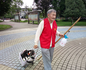 每天,到岳池县文体广场检查是否出现邪教宣传品、拾捡垃圾、向市民宣传创建文明城市知识成了八旬党员李炳才的习惯。