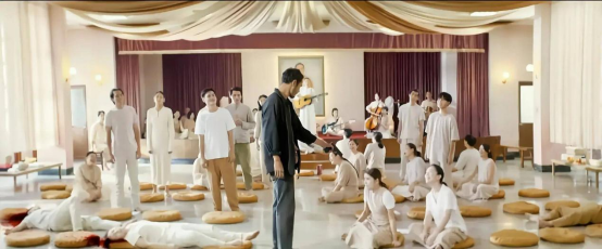 3、邪教教主多擅于乔装演戏。例如,林禄和身着米色棉麻外套+金边眼镜,友善笑容+温柔言语,一副超然物外、渡人渡己的大善人模样,别说陈桂林,银幕外的很多观众也被迷惑了。