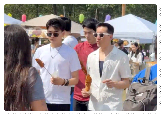 ▲李洪志大妹李萍之子李宝圆(前左穿白色T恤衫者)和李宝满(后穿红色卫衣者),则可徜徉闹市享受“常人”生活。图源:社交媒体X平台视频截图