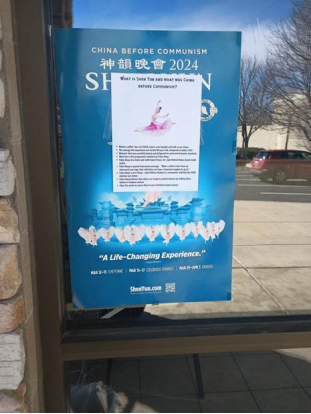 ▲“神韵演出”海报在美国被人贴上有实名例证的黑幕文字。图源:社交媒体X平台