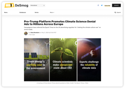 ▲国际环保组织“消除雾霾”调查报告截图。图中是《大纪元时报》在元宇宙平台账号上发布的三个否认气候变化视频