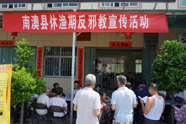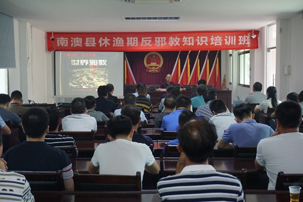 针对渔民出海作业时间长的特点,7月至9月份,县委防范办联合县委政法委、县反邪教协会,利用休渔期空档时间,先后到宅镇城、云澳镇、深澳镇等渔民较多的地区开展反邪教宣传活动。通过集中培训的形式,邀请市法制学校老师面对本岛渔民开展授课,向渔民普及反邪教知识。县委防范办还向参训的渔民发放了《反邪教宣传教育手册》《南澳县反邪教基层工作画册》《反邪教宣传卡片》等宣传资料,并赠送一批反邪教宣传雨伞,实现反邪教知识进村入户。