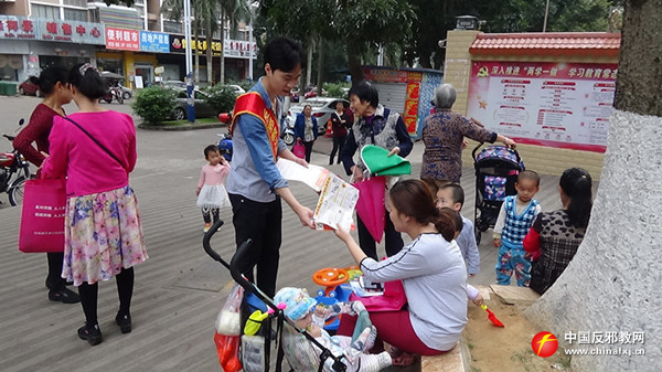 港口区政法委工作人员在金花茶大道附近开展反邪教宣传。
