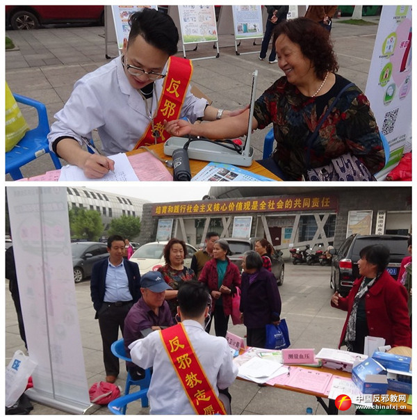 反邪教志愿者为群众免费量血压。