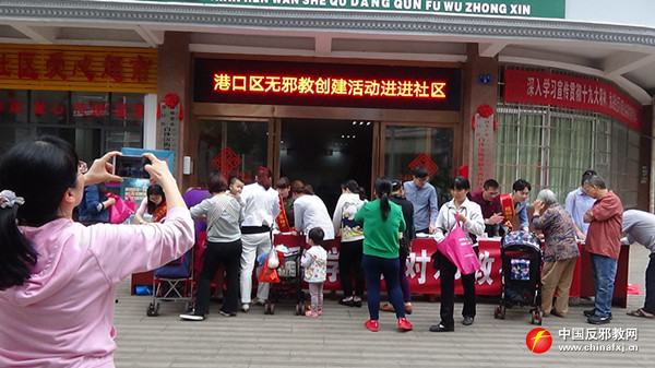 港口区政法委工作人员在步行街开展反邪教宣传。