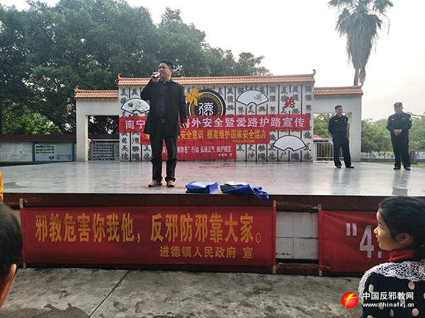 柳州铁路公安处柳州南站派出所会同柳江区进德警务区、进德镇综治办,4月11日上午走进柳江区进德中心小学,开展“小手拉大手、拒邪齐参与”为主题的全民国家安全日暨反邪宣传进校园活动。活动中,悬挂宣传横幅、发放反邪宣传资料,向柳江区进德中心小学全体师生宣传了反邪教相关知识,呼吁全体师生要从我做起,自觉参加拒绝邪教的队伍中,要从小树立“崇尚科学,反对邪教”的正确观念。