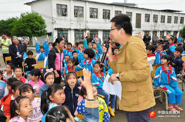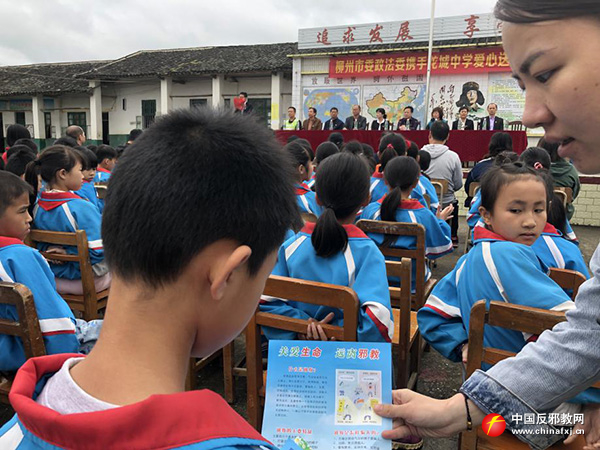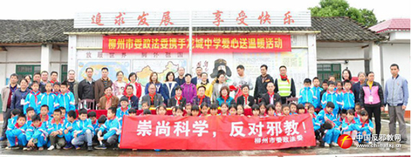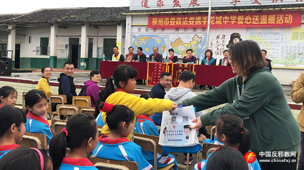 5月8日,广西柳州市委政法委携手柳州龙城中学在柳城县雷塘村小学举行爱心送温暖活动,捐赠仪式结束后开展了反邪教警示教育宣传。