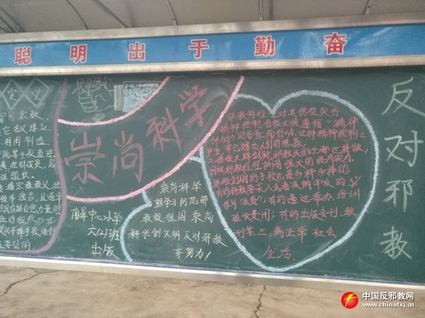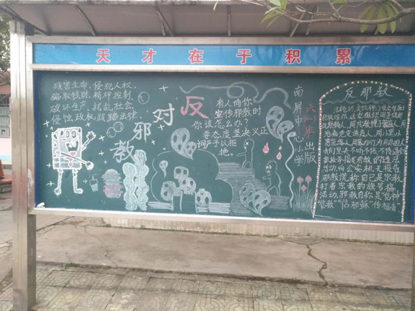 图为南屏瑶族乡中心小学的学生创编的反邪教黑板报。