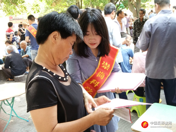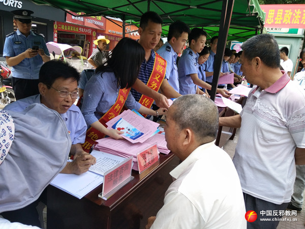 图为反邪教义务宣传员向群众发放反邪教宣传资料、宣讲法律法规。