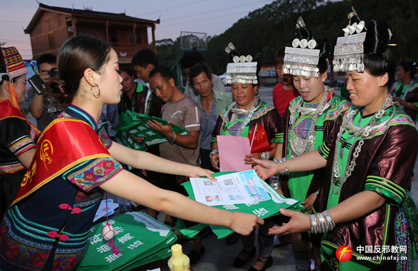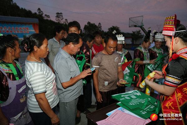 活动现场,苗胞在寨口架起芦笙,摆起了俗称“三关”的酒阵,迎接远方来的客人。身披“我为反邪教代言、崇尚科学·反对邪教”绶带的8位反邪教“金花”向“过三关”酒阵的游客发放反邪教宣传资料,解说反邪教知识,并到长桌宴上与游客互动,即兴对唱反邪教山歌。篝火晚会现场,挂起反邪教横幅,摆起反邪教知识展板,立起反邪教二维码版面,反邪教宣传资料和宣传品摆满两张长桌,吸引了现场群众争相前来领取宣传资料和宣传品,询问相关知识,参与“中国反邪教”微信公众号“对邪教说不”网络签名。活动中,群众在工作人员和反邪教金花的带动下,挥舞着小国旗声情并茂地合唱《我和我的祖国》,把活动推向高潮。