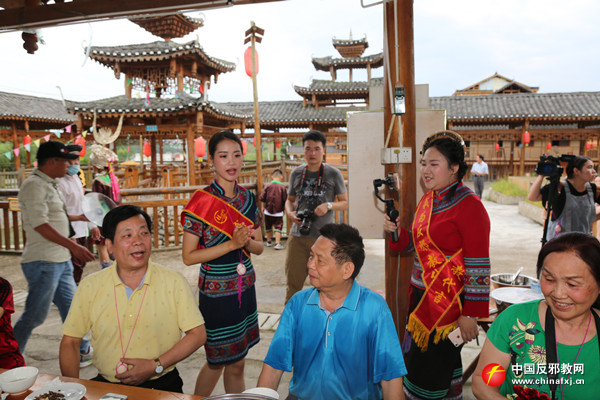 反邪教“金花”与长桌宴游客即兴对唱反邪教山歌。