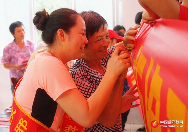 在加司村,100多名留守老人和儿童欢聚一起,身披“我为反邪教代言”的大学生志愿者以拉家常方式与大家沟通交流,向他们发放反邪教宣传单,送上生活用品,耐心细致地向他们讲解宣传单上的内容,认真解答他们的疑问,鼓励、帮助有手机的老人扫二维码进行网络签名反邪教。带队老师在课堂上深入浅出地剖析“法轮功”、“全能神”等邪教案例,用通俗易懂的语言就什么是邪教、如何防范和抵制邪教进行详细讲解,并时不时与留守老人和儿童互动。活动结束前,大家还踊跃在“崇尚科学·反对邪教”横幅上亲笔签名反对邪教。
