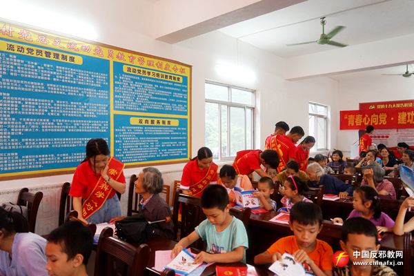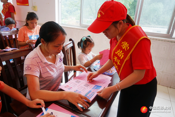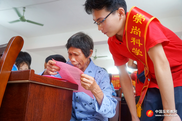 志愿者发放宣传资料并向留守老人和儿童解说反邪教知识。