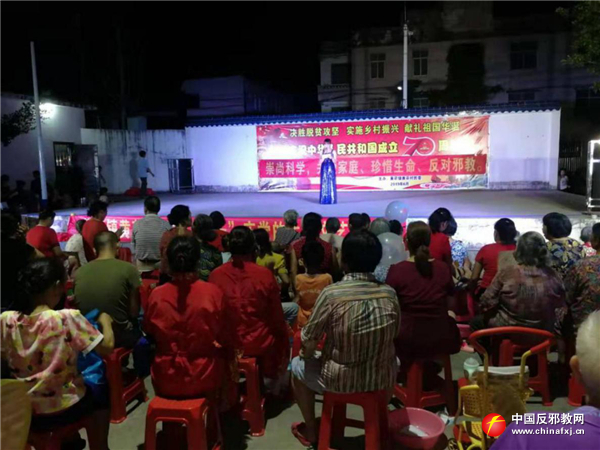 在玉村文艺晚会上宣传反邪教知识。