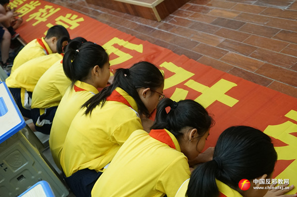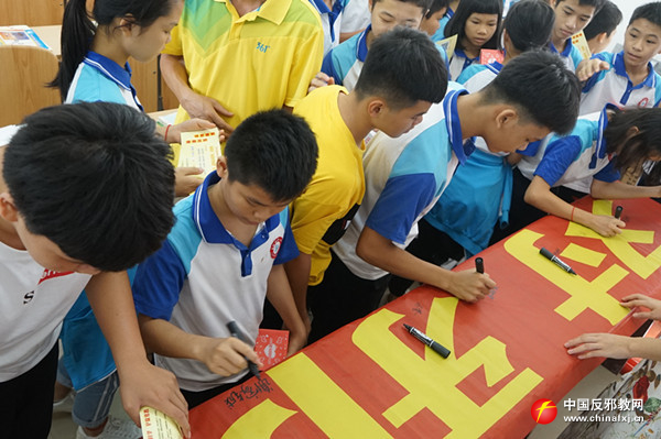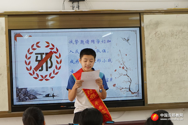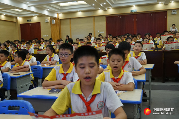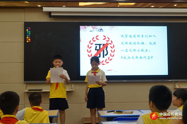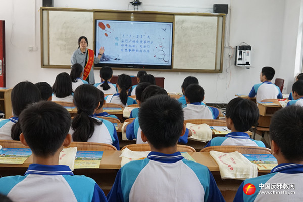 玉州区实验三小的课堂上,巾帼文明岗反邪志愿者以青少年的心理特征和认知水平为依据,针对不同年龄层次的青少年规划匹配的法制教育知识架构,通过视频探究、讲问互动、PPT讲解等方式全面系统地阐述了邪教的本质及其危害,并结合在反邪教斗争中青少年遭受侵害的真实案例,多视角立体化地剖析了邪教罪恶面目,引导青少年以科学的态度,正确辨别外界信息的真伪,将反邪教理念转化为自身的内在追求。最后,反邪教志愿小战士代表宣读“我为反邪教代言”倡议书,号召青少年将《文明家庭拒绝邪教承诺签名》带回家,通过小手拉大手,让青少年带动家长和家庭共同开展反邪教行动。