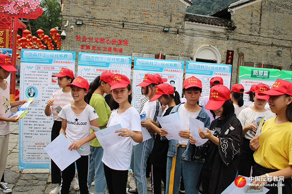 图为工作人员发放反邪教宣传资料