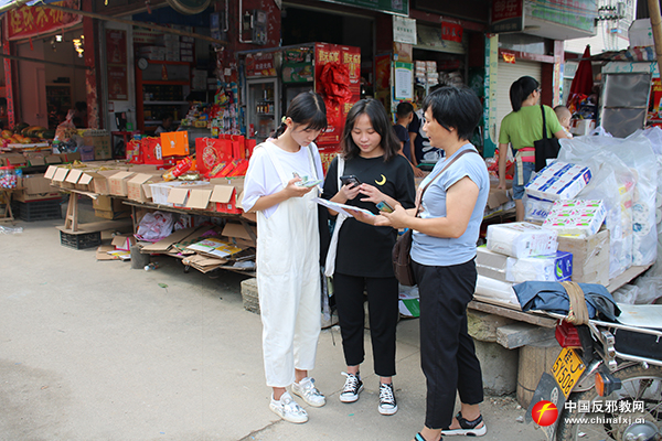 反邪教宣传工作人员走街串巷发放反邪教宣传资料。