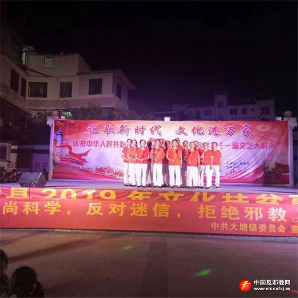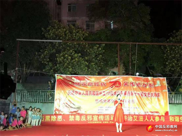 为助力2019年脱贫摘帽工作,广西忻城县举办“奋进新时代 唱响新忻城”系列文艺演出,县委政法委借此契机将反邪教宣传融入活动中。