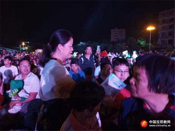 9月29日,忻城县在红渡镇红川广场举办“奋进新时代 唱响新忻城”文艺晚会。演出现场,反邪教宣传员在广场出入口设立反邪教宣传展板,并向来观看演出的群众发放反邪教宣传资料,认真讲解邪教的特征、邪教骗人的手法、邪教的危害等基本知识,引导群众积极参与“对邪教说不”“广西文明家庭拒绝邪教”网络签名活动,营造“人人识邪教 人人反邪教”的浓厚氛围。