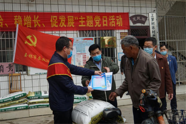 为减少人员聚集,密集接触,党员干部们通过电话联系的方式,让贫困户分批分时间段前来村委小广场领取物资。党员干部们两两合力把每袋100斤重的化肥装上群众的车后座,并绑牢扎稳。同时,党员干部们把春耕生产工作指南、防控健康知识宣传资料,反邪教宣传资料发到群众的手中,并动员群众不误农时开展春播,提醒群众对疫情防控思想意识和行为不能松懈,告诫群众谨防邪教组织干扰破坏。