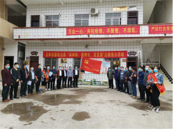 华夏春已至,当下正值春耕播种好时节,习总书记强调,要“不失时机抓好春季农业生产”。广西壮族自治区玉林市委政法委结合近期疫情防控、扶贫工作实际,3月11日下午,党支部26位党员干部高举党旗到结对帮扶村仁厚镇上罗村,开展“保供给、稳增长、促发展”主题党日活动,送去化肥、农药等春耕物资以及消毒液等疫情防护用品,并利用此有利时机,向群众做好疫情防控宣传和反邪教宣传,切实做到疫情防控,防邪拒邪和助力春耕“三不误”。
