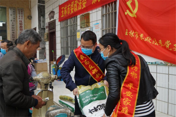 此次党日活动,玉林市委政法委党支部为该村帮扶的40多户贫困群众送去15000多斤化肥、100多升农药、4个消毒液喷洒器以及60瓶84消毒液等物资。