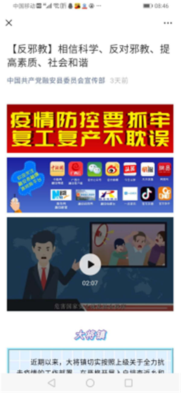 二是充分利用县乡村三级新媒体矩阵宣传。通过将疫情防控与反邪教的宣传知识、视频发到乡镇,要求乡镇网格员将微信消息转发到各个村委社区的微信群里,借助新媒体宣传到千家万户。