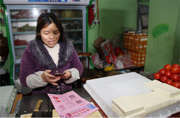摊主用手机扫码关注中国反邪教微信公众号并进行“对邪教说不”网络签名