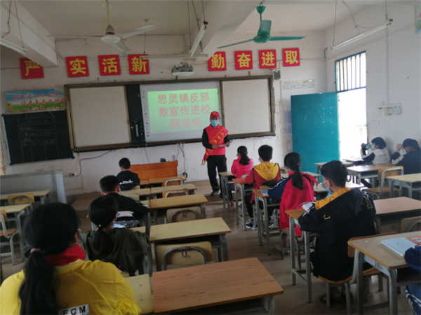 学生返校后,金鸡乡、黄茆镇、通挽镇、思灵镇反邪教志愿者们召开主题班会,通过利用音响、视频和组织主题班会课等形式向返校学生宣传防范邪教的知识,揭示邪教的丑恶面目和害人本质,提醒他们提高警惕,谨防邪教的侵扰,养成科学健康的生活与学习习惯,少出门、戴口罩、勤洗手、常通风,科学防疫。