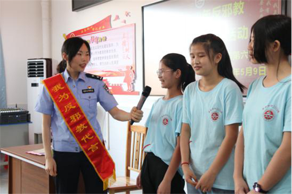 “同学们要记住,邪教的本质是反人类、反科学、反社会、反政府,邪教的基本特征是……”随着各中小学开学复课,2020年5月9日上午,广西壮族自治区梧州市藤县县委政法委副书记李伟明带领政法干警、反邪教宣传形象大使,到藤县第六中学开展反邪教宣传教育进校园活动,为久别校园的广大学子们上了藤县2020年开展反邪教宣讲活动的第一课,并给学生们送上反邪教警示教育“口袋宝典”——《反邪教警示教育应知应会十问十答》宣传小册子。