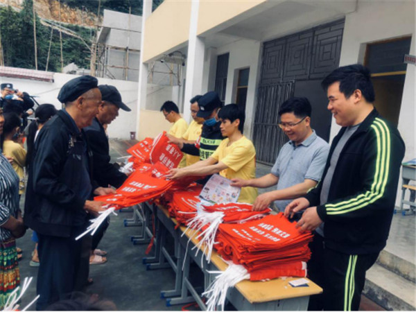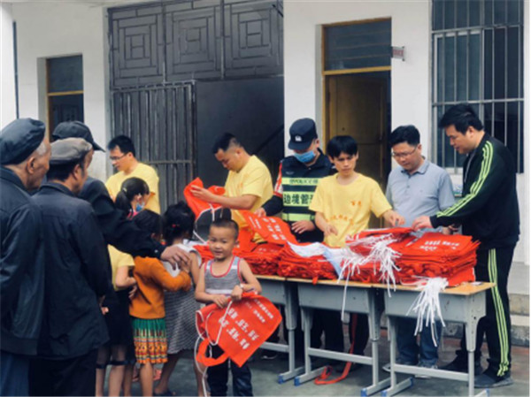 宣传现场悬挂宣传横幅,设立咨询台,向苗寨边民发放宣传资料