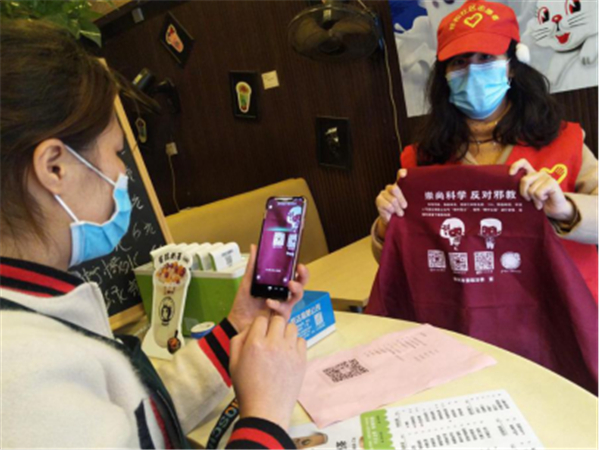 为进一步扩大反邪教宣传广度和深度,巾帼志愿者深入街头巷尾、商铺修理店、私企小作坊等场所开展反邪教宣传活动,扩大反邪宣传覆盖面。巾帼志愿者以通俗易懂的语言向群众普及反邪教知识,动员广大妇女加入反邪教队伍,发现邪教立即举报,教育家人及身边的朋友相信科学,坚决远离邪教,激励广大居民群众树立“反对邪教、人人有责”的意识。