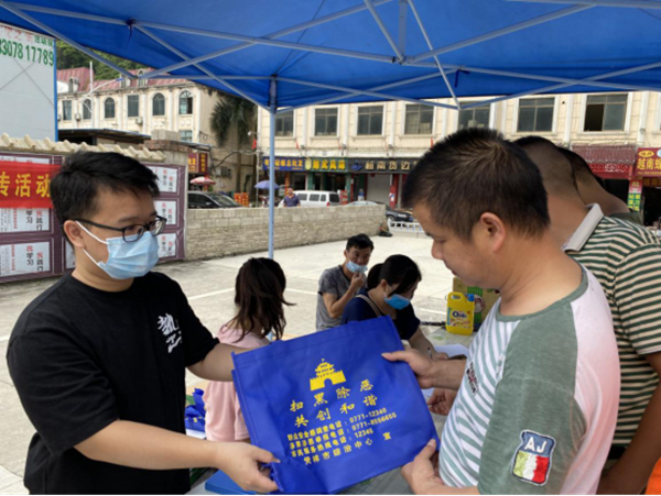 6月9日上午,广西壮族自治区凭祥市委政法委组织反邪教宣讲团深入友谊镇中越边境浦寨边贸互市点,在国门大厦广场向群众开展以“崇尚科学,反对邪教”为主题的反邪教宣讲活动。引导边民、客商、环卫工人、学生等群体认真学习反邪教法律法规知识,确保不信邪、不传邪、不参邪,积极举报邪教违法活动,坚决跟邪教作斗争,为构建幸福美满和谐边关贡献力量。