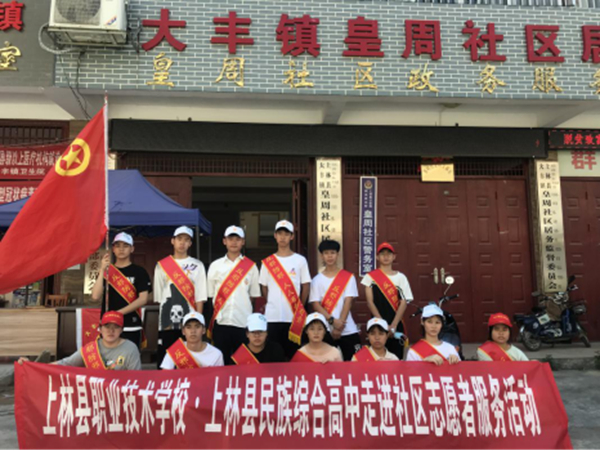 6月19日上午,广西上林县职业技术学校(上林县民族综合高中)在上林县委政法委的指导下,组织学生志愿者深入社区、小区开展反邪教暨国家安全宣传教育活动。