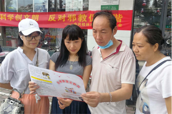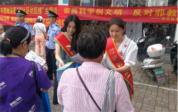 为强化居民群众对邪教危害的认识,加大反邪教宣传警示教育力度,引导全民认清邪教、拒绝邪教、远离邪教,提高辖区社会的反邪教能力,近日,广西壮族自治区桂林市委政法委组织机关工作人员走进叠彩区燕湖社区,开展反邪教宣传活动。