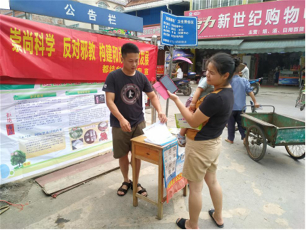 在“线下”,深入群众强化宣传。充分发动基层力量深入农贸市场、村屯社区,采取悬挂横幅、展示宣传画报、发放宣传资料等方式开展反邪教警示教育,同时,利用街圩人流量多的特点,开设宣讲咨询台,为群众提供反邪教法律咨询服务、发放小礼品、开展互动环节等多种形式,为群众答疑解惑。今年上半年,全县共开展宣讲活动11场次,现场答疑800余人次;深入群众发放宣传资料10000多份。