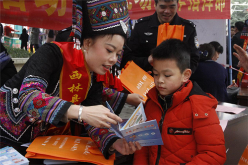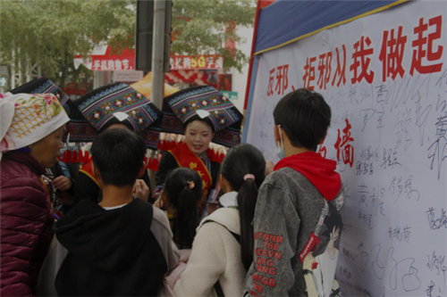 在公园通往美食街的路口,两条反邪教大红宣传横幅跨街而悬,十分显眼。“西林县第七届句町文化艺术节暨反邪教宣传活动”的横幅下,是西林县政法委联手广西反邪教网设置反邪教宣传点,展台、展板和“反邪拒邪 从我做起”签名墙,吸引川流不息的过往行人驻足。十多名政法干警和穿着民族服装的志愿者向群众发放《西林县反邪教宣传手册》《全民反邪教倡议书》等反邪教宣传资料,解答群众咨询的反邪教法律和有关事项,就邪教组织反科学、反社会、反人类、反政府的罪恶本质和残害生命、泯灭亲情、祸害家庭、骗取钱财的滔天罪行进行宣传解释,赠送反邪教小礼物,引导到签名墙签名。工作人员和志愿者还不时走进人群,进行反邪教知识有奖问答。