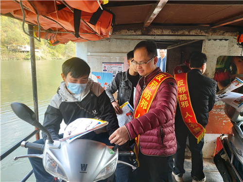 “邪教往往在老百姓日常最关心的平安、健康等问题上打主意、做文章,欺骗群众。说什么只要虔诚祷告,不用打针、吃药,疾病自然会好……他们骗取钱财,要求练习人员放弃家庭、亲情,破坏了无数的家庭,给社会带来了巨大的伤危害,要坚决予以抵制!”为深入做好当前新冠肺炎疫情防控工作,防止邪教趁机捣乱破坏,维护全区政治大局稳定,今年元旦以来,广西壮族自治区梧州市藤县县委政法委早谋划、早部署,牵头落实“战疫情、保稳定”工作机制,一手扎紧“疫情”阻击网,一手筑牢“邪教”防控网,深入农村地区村屯开展反邪教宣传,实现“抗疫反邪”两张网同频共振齐发力,反邪教宣传不松懈。
