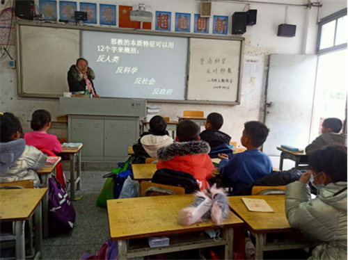 学校还利用班会课,开展了春季学期开学“崇尚科学,反对邪教”教育主题班会活动。班会课上,各班主任围绕邪教的定义、邪教的特征、邪教的危害、怎样防范邪教等反邪教知识,给学生上了一堂生动有趣的宣传教育课。