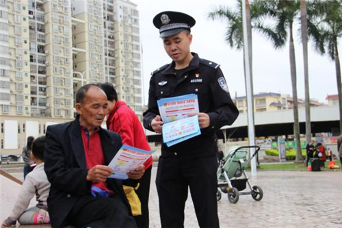 4月9日,在龙圩世纪广场。民警通过设立咨询台,采用现场宣传、悬挂横幅标语、摆放宣传展板、发放宣传奖品等形式,为辖区群众阐释国家安全法律法规,普及《反恐怖主义法》《国家安全法》《境外非政府组织境内活动管理办法》等相关法律法规。