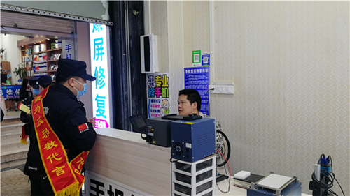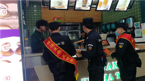 “反邪卫士”沿街面向商户讲解发放反邪教知识资料