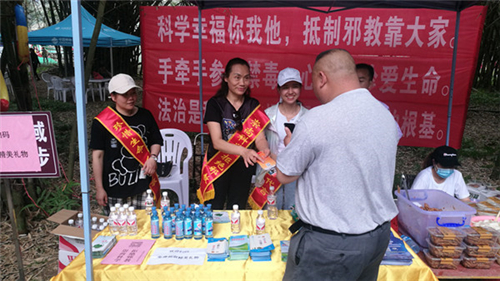 4月24日,下桥养生谷景点里人来人往,金城江区政法委部门在游客必经之路旁设立宣传站点,悬挂红色横幅,桌上摆满了反邪教宣传折页、反邪教宣传品等。身披反邪教绶带的“反邪卫士”向过往群众发放宣传材料,热心讲解反邪教知识,引导他们用手机扫码参加“对邪教说不”和“广西文明家庭拒绝邪教”网络签名,鼓励他们回去后要向亲朋好友宣传反邪教知识。