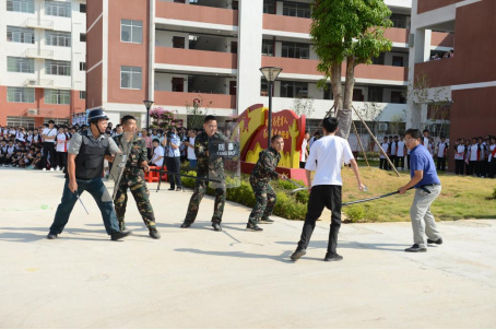 开展一次反暴恐处置演练。本次演练模拟了两名持刀“暴徒”欲强行入侵学校并袭击师生,校园安保人员与公安民警迅速反应,密切配合,成功制服“暴徒”的场景。整个演练过程紧凑、逼真,考验了校园安保人员的警惕性和各部门间的协同联动能力,也进一步提高全体师生对暴恐事件的预防和应急处置能力。
