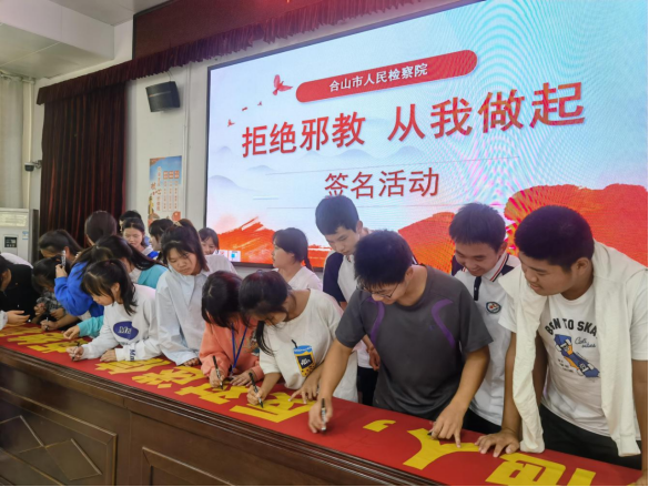 参与一次反邪教签名。课程最后,全体师生依次在“热爱生活,关爱他人,反对迷信,拒绝邪教”的条幅上签名,表名崇尚科学、反对邪教、构筑和谐校园的决心。大家在签名后纷纷表示“要坚决同邪教组织作斗争,主动参与到反邪教队伍中来,争当反邪教志愿者,做到不听、不信、不传播邪教!”