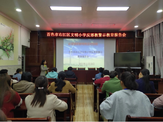 岁末年初,广西百色市右江区主动作为,进一步推进反邪教警示教育进校园活动,2021年12月,利用一个月的时间,通过“四举措”全力发动学校广大师生参与反邪教宣传教育活动,创新宣传形式和手段,强化各项工作措施,进一步掀起反邪教警示教育进校园活动新高潮。