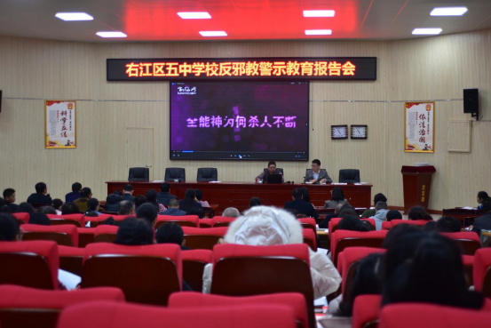 举措二:每个学校举办一场报告会。右江区有43所中小学校,全部由校长给本校师生作一场反邪教警示报告会,在校内全方位普及反邪教知识。