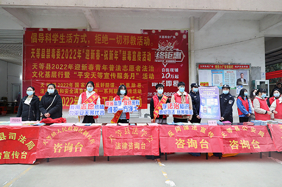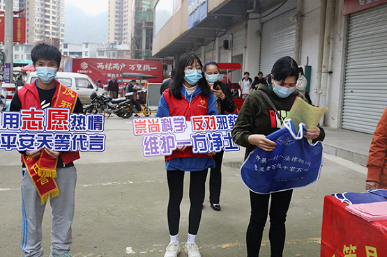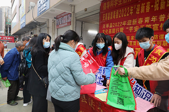 近日,广西壮族自治区崇左市天等县委政法委组织公安、司法、妇联、天等镇政府等单位以及青年志愿者在县城天富广场开展宣传活动,摆设宣传咨询台,开进宣传车,志愿者手举宣传牌,向过往群众宣传反邪教知识,前后共发放反邪教宣传单1000多张、宣传围裙600多个。