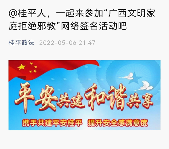 为广泛发动辖区群众积极参加“广西文明家庭拒绝邪教”网络签名活动,桂平市充分利用“线上+线下”宣传渠道双联动号召群众参加网络签名。一方面在“桂平政法”微信公众号开设网络签名栏目,为群众详细说明“广西文明家庭拒绝邪教”网络签名流程,为网络签名活动造势;另一方面,桂平市委政法委联合司法所、派出所开展反邪教警示教育活动,为群众发放反邪教网络签名流程单和反邪教宣传知识手册,引导群众参与网络签名活动。