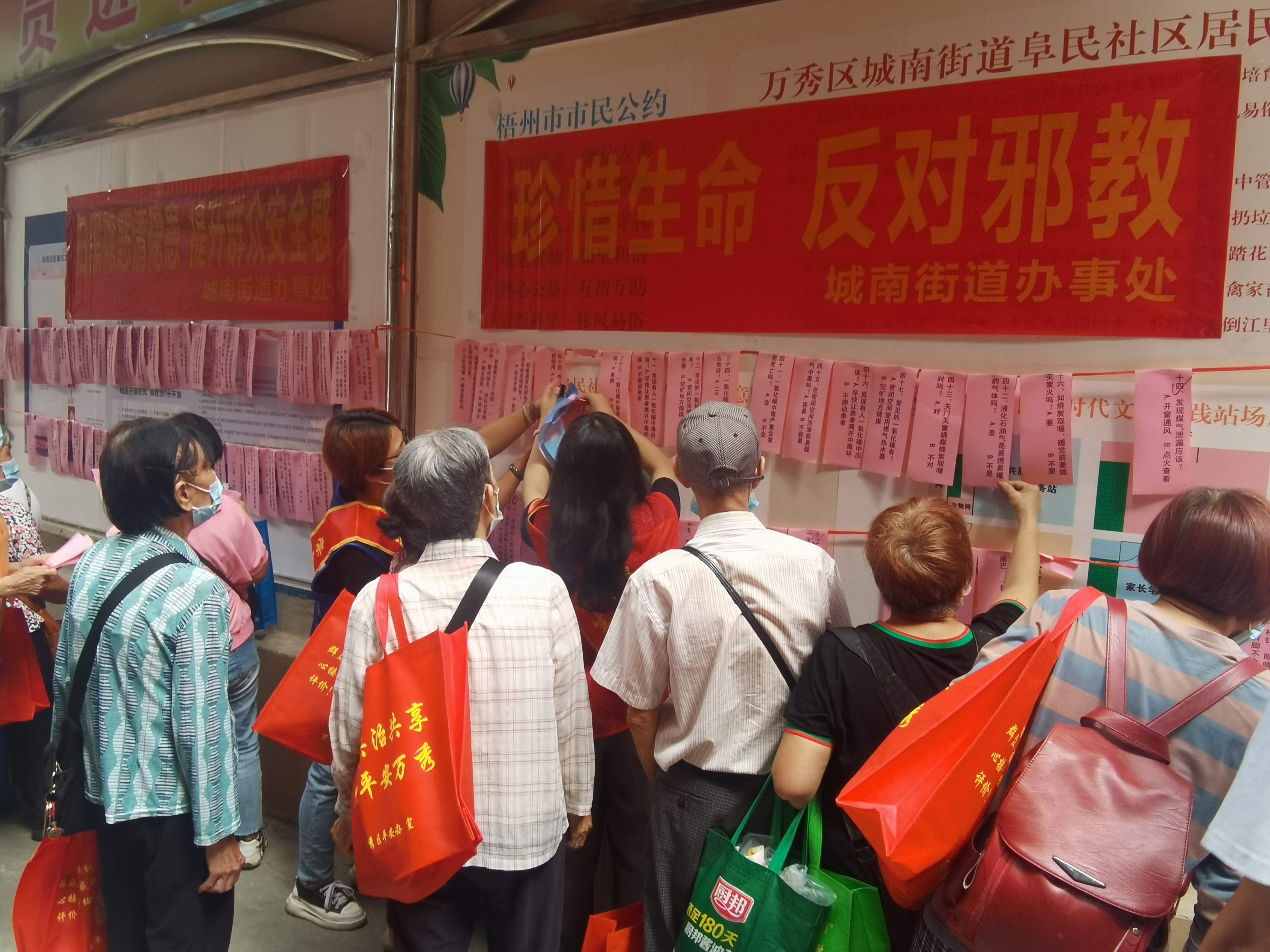 为丰富社区居民的文化生活需求,愉悦身心、陶冶情操,搭建居民之间相互交流沟通平台,增进“邻里情”,9月30日上午,广西壮族自治区梧州市万秀区城南街道联合阜民社区双报到单位中共梧州市委讲师团、珠海港(梧州)港务有限公司举行“同心齐向党 喜迎二十大”反邪教知识猜谜活动。