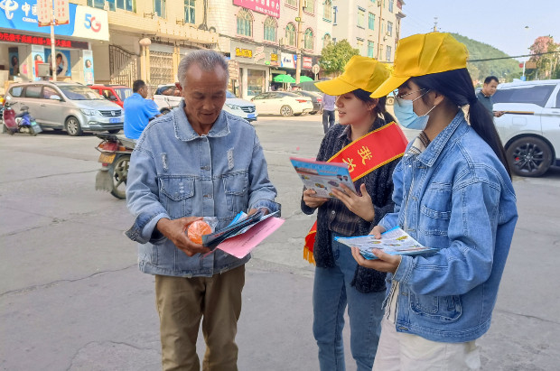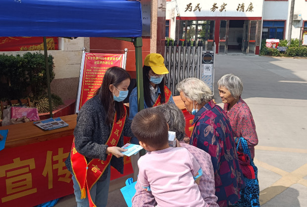工作人员向群众发放反邪教宣传品和宣传资料,并讲解反邪教知识